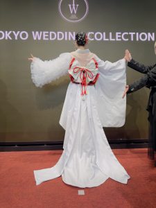 平安時代と現代をイメージし、ウエディングドレスをベースに日本の伝統的な婚礼衣装である白無垢、最高位の女性装束である十二単を現代に落とし込んだデザイン。